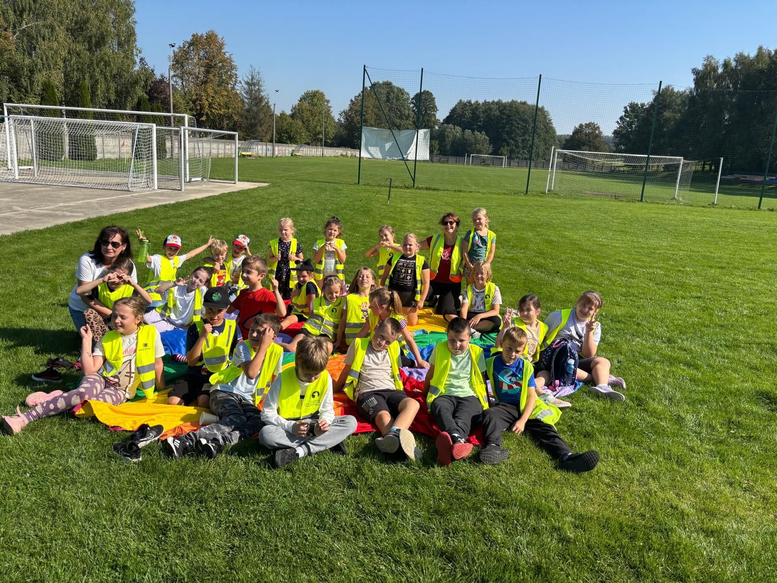 Podczas dłuższego spaceru drugoklasiści świecili przykładem i zachęcali mieszkańców Grojca do noszenia elementów odblaskowych. Rodzice zadbali o przygotowanie pysznych kiełbasek i napojów, a nauczycielki poprowadziły zabawy integracyjne oraz odblaskowe konkurencje sprawnościowe. Wszyscy uczestnicy w ramach rozgrzewki dzielnie pokonali dystans wokół boiska. Wiele pozytywnych emocji wzbudziło przeciąganie liny i wyścigi zręcznościowe. Chętni mogli zagrać w badmintona i piłkę nożną oraz uczestniczyć w zabawach z chustą animacyjną. Na szczególne uznanie zasługują uczestnicy biegu przełajowego, którzy świetnie poradzili sobie z obiegnięciem całego boiska. Bardzo dziękujemy Rodzicom z obu klas za zaangażowanie w organizację spotkania. Klubowi LKS „Solavia Grojec” dziękujemy za gościnność i życzymy wielu sukcesów sportowych.