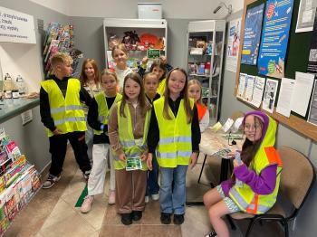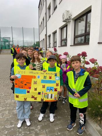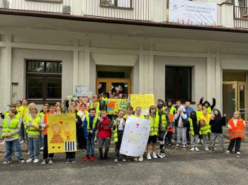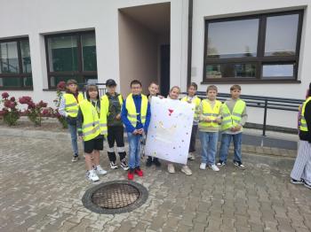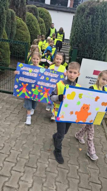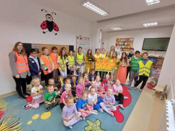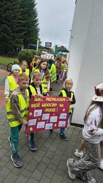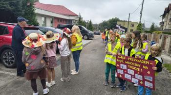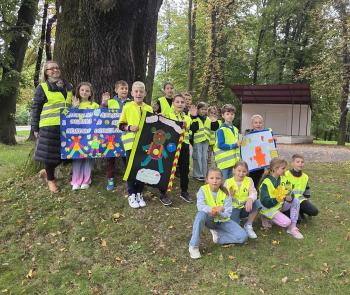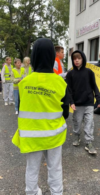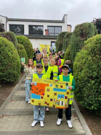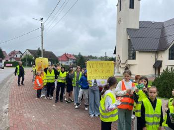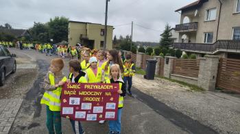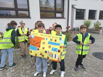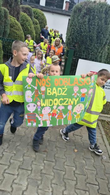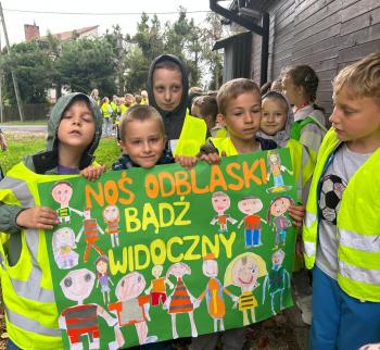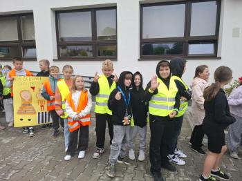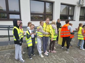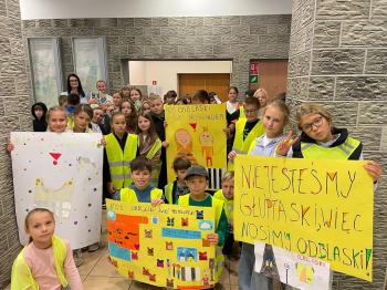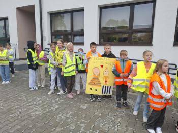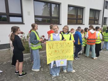 Podczas spaceru towarzyszyły nam plakaty własnoręcznie przygotowane przez uczniów oraz ulotki, które rozdawaliśmy przechodniom i zostawialiśmy w odwiedzonych punktach. Tym samym promowaliśmy noszenie odblasków jako elementu codziennego bezpieczeństwa.