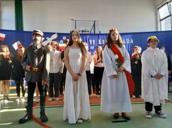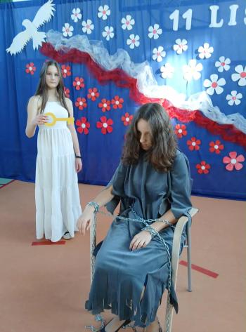 Centralnym punktem programu była inscenizacja zatytułowana „Wolność to...”, przygotowana przez ósmoklasistów. Uczniowie w symboliczny sposób ukazali losy Polski podczas okresu zaborów. Na scenie pojawiła się alegoria Polski – kobieta w więziennych kajdanach, prowadzona przez trzy czarne orły, symbolizujące zaborców. Wystąpił również biały orzeł, który niósł nadzieję i wiarę w odrodzenie Ojczyzny. Duże zainteresowanie wzbudziła też postać komendata, czyli Józefa Piłsudskiego, ubranego w replikę polskiego munduru z okresu międzywojennego. Wzruszająca gra młodych aktorów oraz kostiumy sprawiły, że publiczność mogła głęboko przeżyć przedstawione wydarzenia.