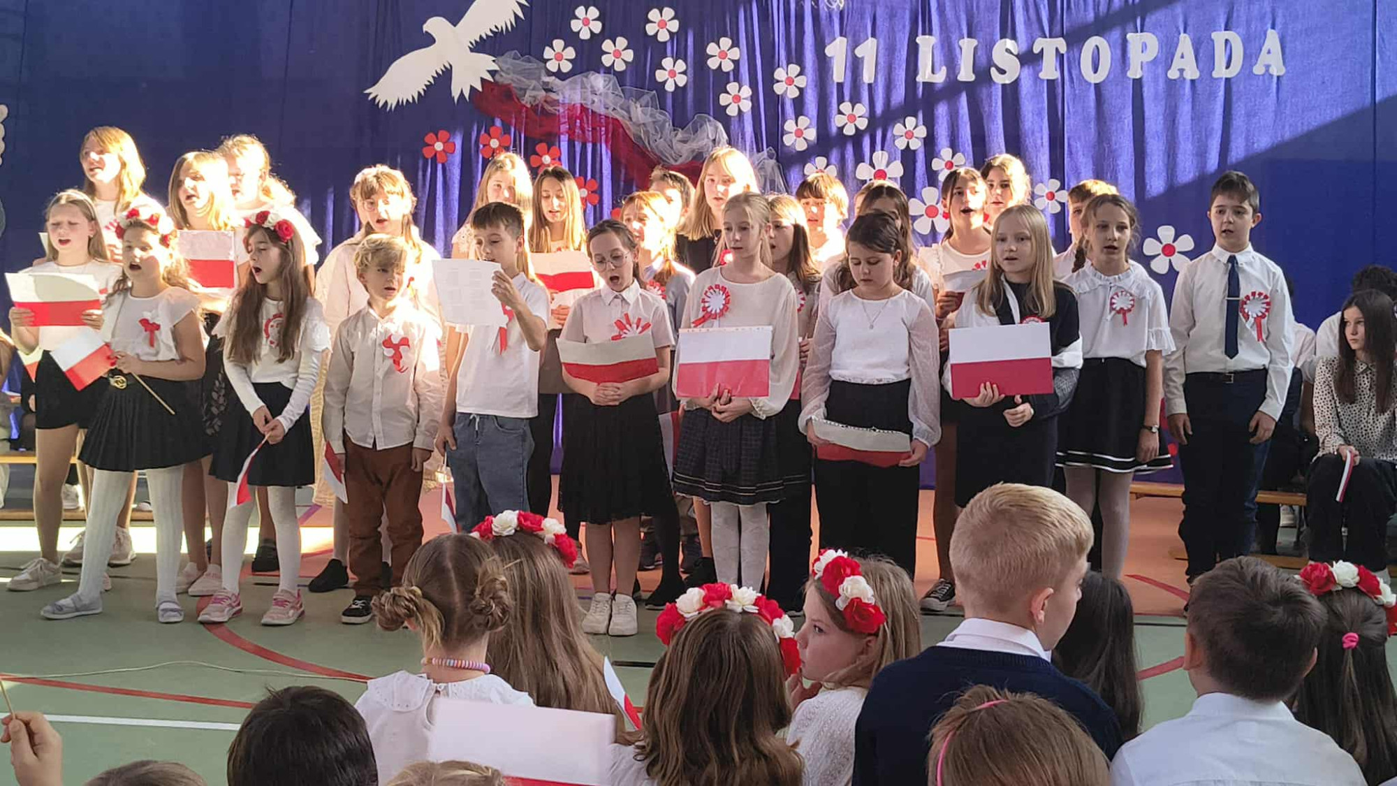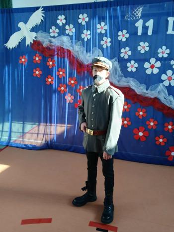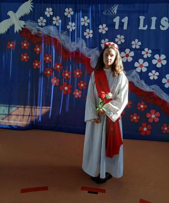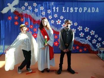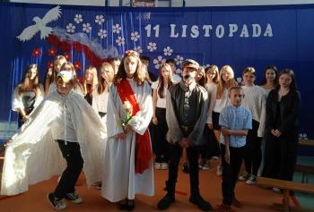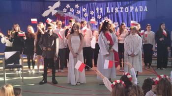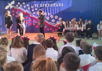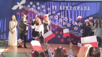 Tegoroczne obchody rozpoczął występ szkolnego chóru, który wprowadził wszystkich w podniosły nastrój, wykonując trzy pieśni patriotyczne. Następnie wystąpiła solistka- Maja Kędracka z niezwykłą interpretacją piosenki "Rozkwitały pąki białych róż".