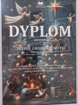Naszą szkołę reprezentował zespół GROJECKIE NUTKI, który wprawił w zachwyt słuchaczy pięknym wykonaniem pastorałek Grajmy Panu oraz Pastuszkowie, gdzie tak gnacie. Oprócz zespołu GROJECKIE NUTKI w przeglądzie wystąpiły również Zosia Polak z klasy pierwszej oraz Maja Kędracka z klasy szóstej, które zaśpiewały z zespołem PrzeCisza, gospodarzem przeglądu. Dla tamtego zespołu był to szczególny dzień, gdyż dziewczęta po raz pierwszy wystąpiły w nowych gorsetach. To sobotnie popołudnie pozostanie na długo w pamięci wszystkich uczestników